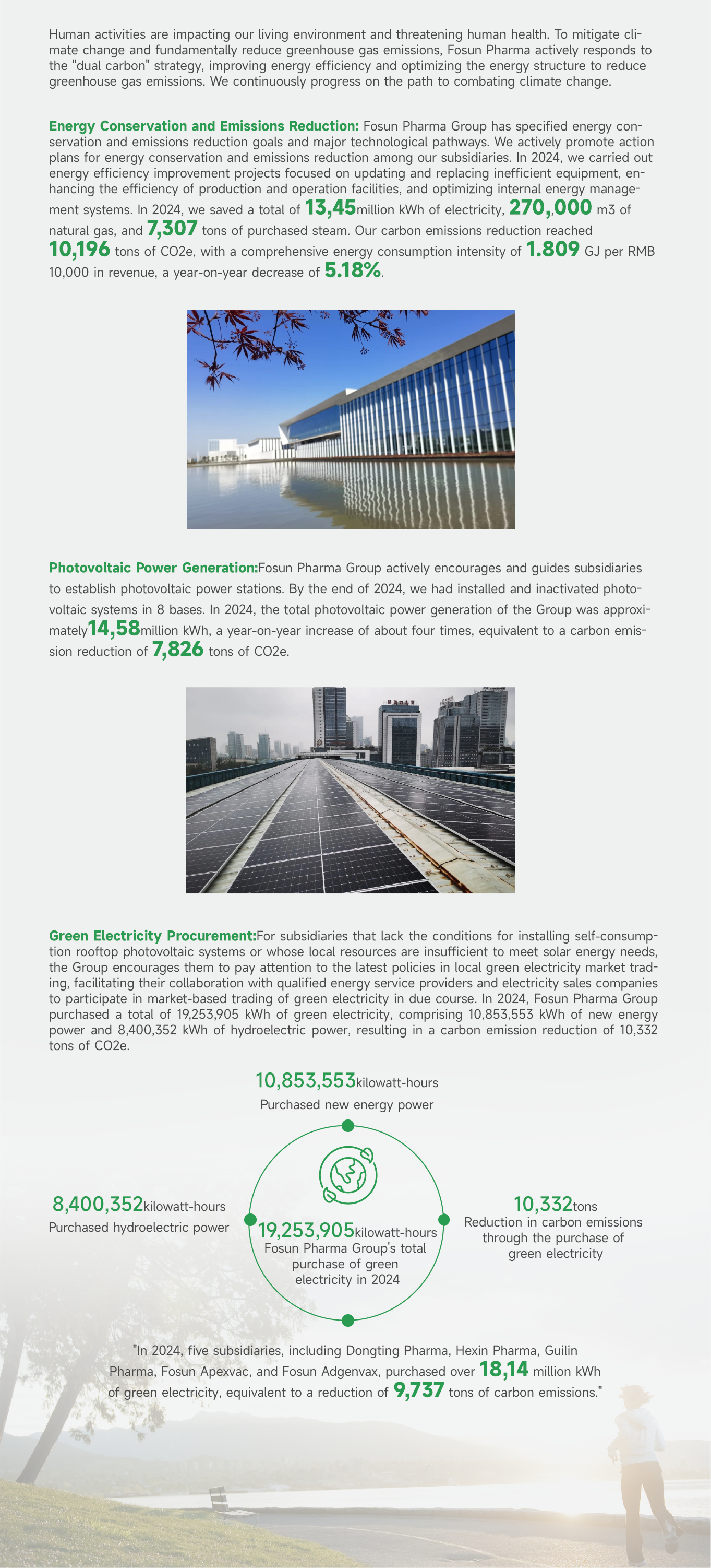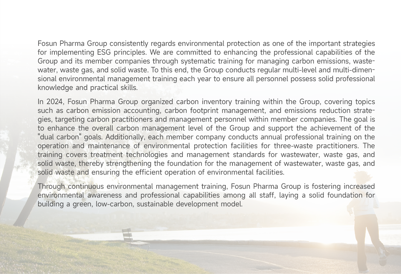 Fosun Pharma is committed to advancing green development and the "dual carbon" strategy in response to the Paris Agreement, actively addressing the challenges posed by climate change. Our environmental protection policy focuses on "pursuing environmental and social sustainability, preventing pollution, actively promoting energy conservation and emissions reduction, protecting ecological diversity, and building environmentally friendly communities," with the goal of fostering harmonious development among companies, society, and the environment and collectively creating a beautiful green home.